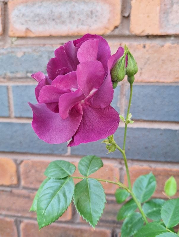 The purple rose Tim and I saved last year is thriving in a pot on our back porch, and this is her first bloom this year.