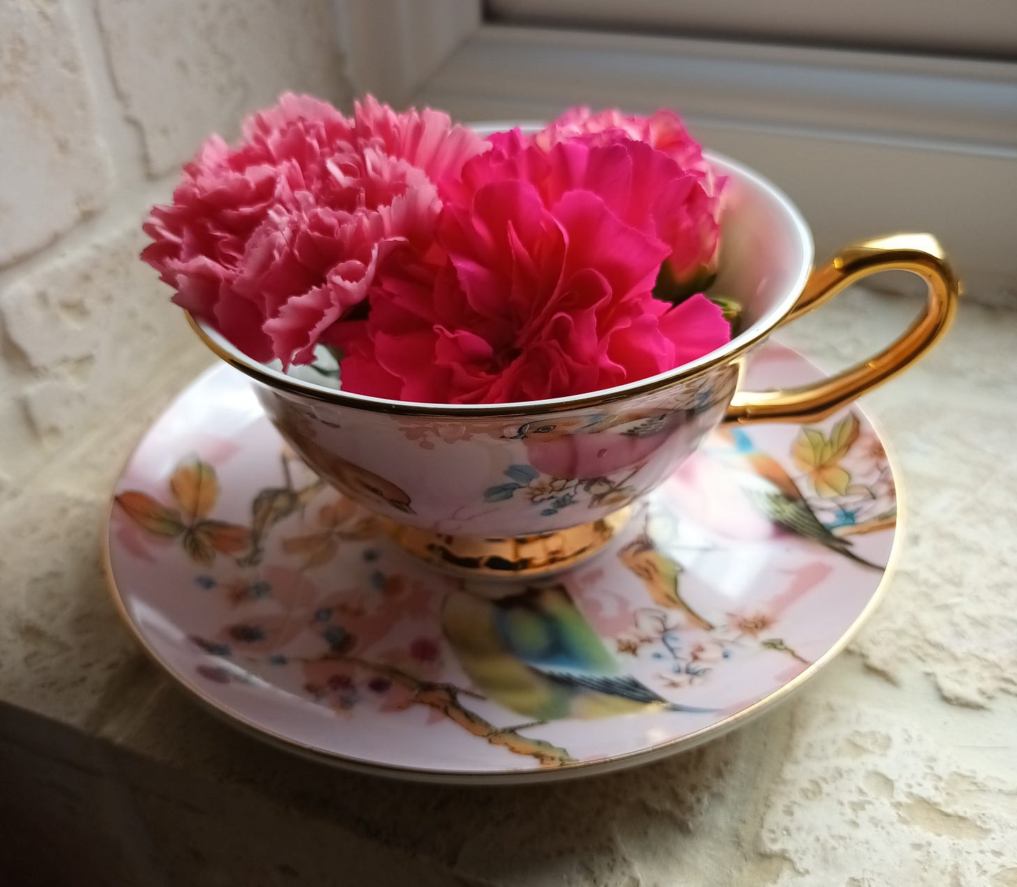 The picture is a gifted tea cup and saucer, and it holds some broken flowers rescued from the pathway outside a crematorium chapel. I can’t bear to leave them lying there.