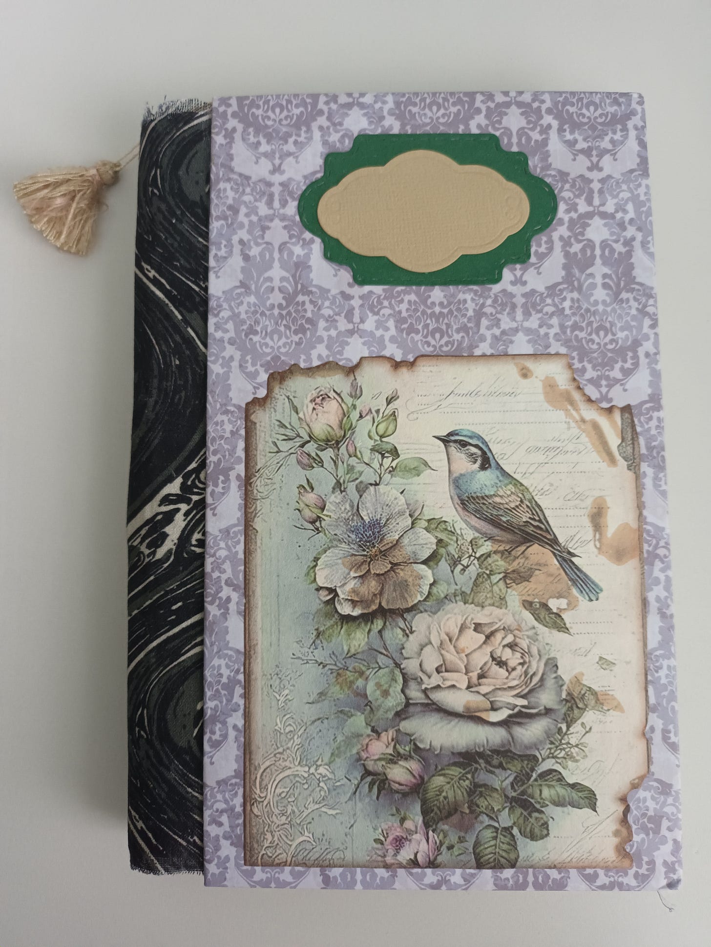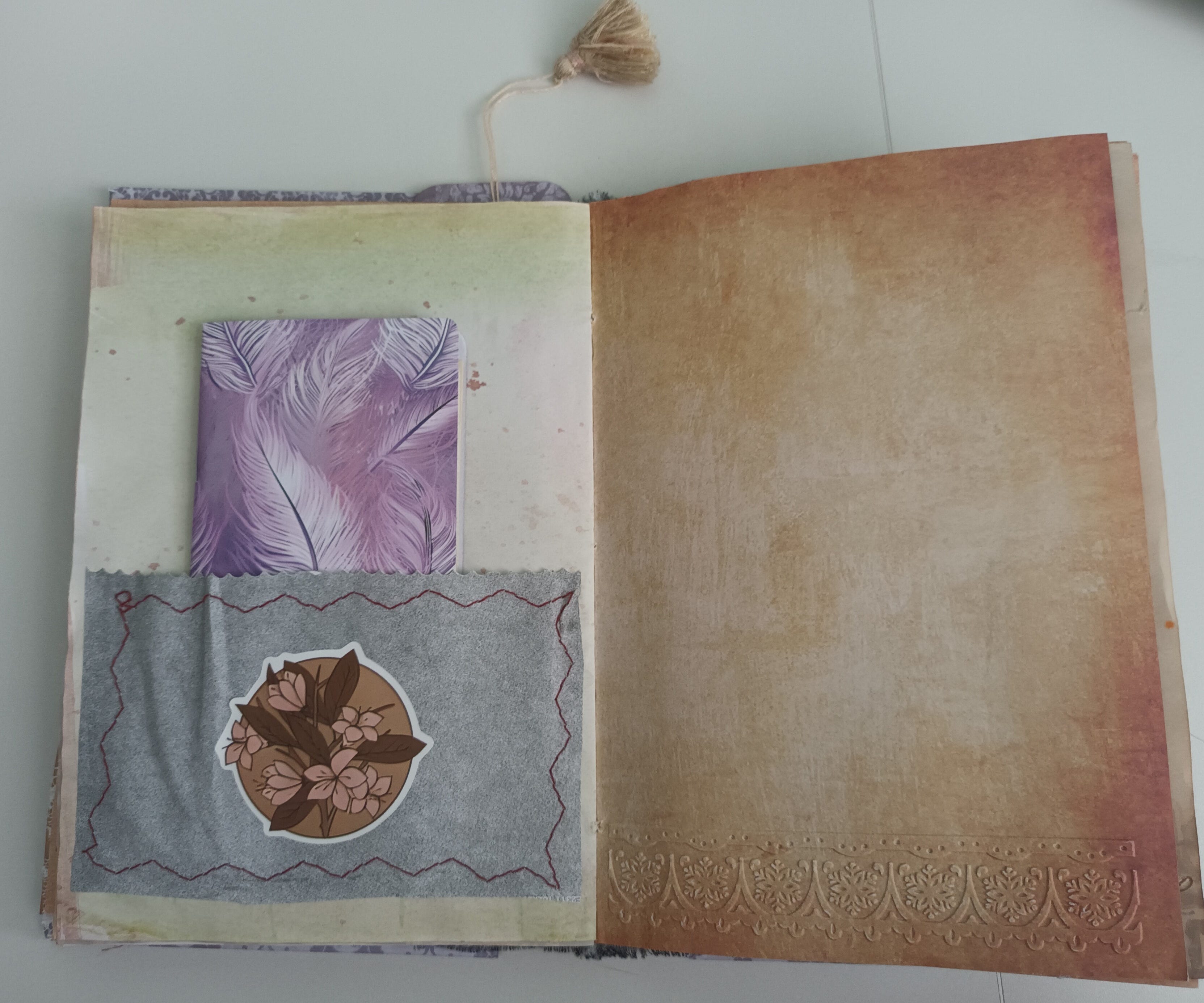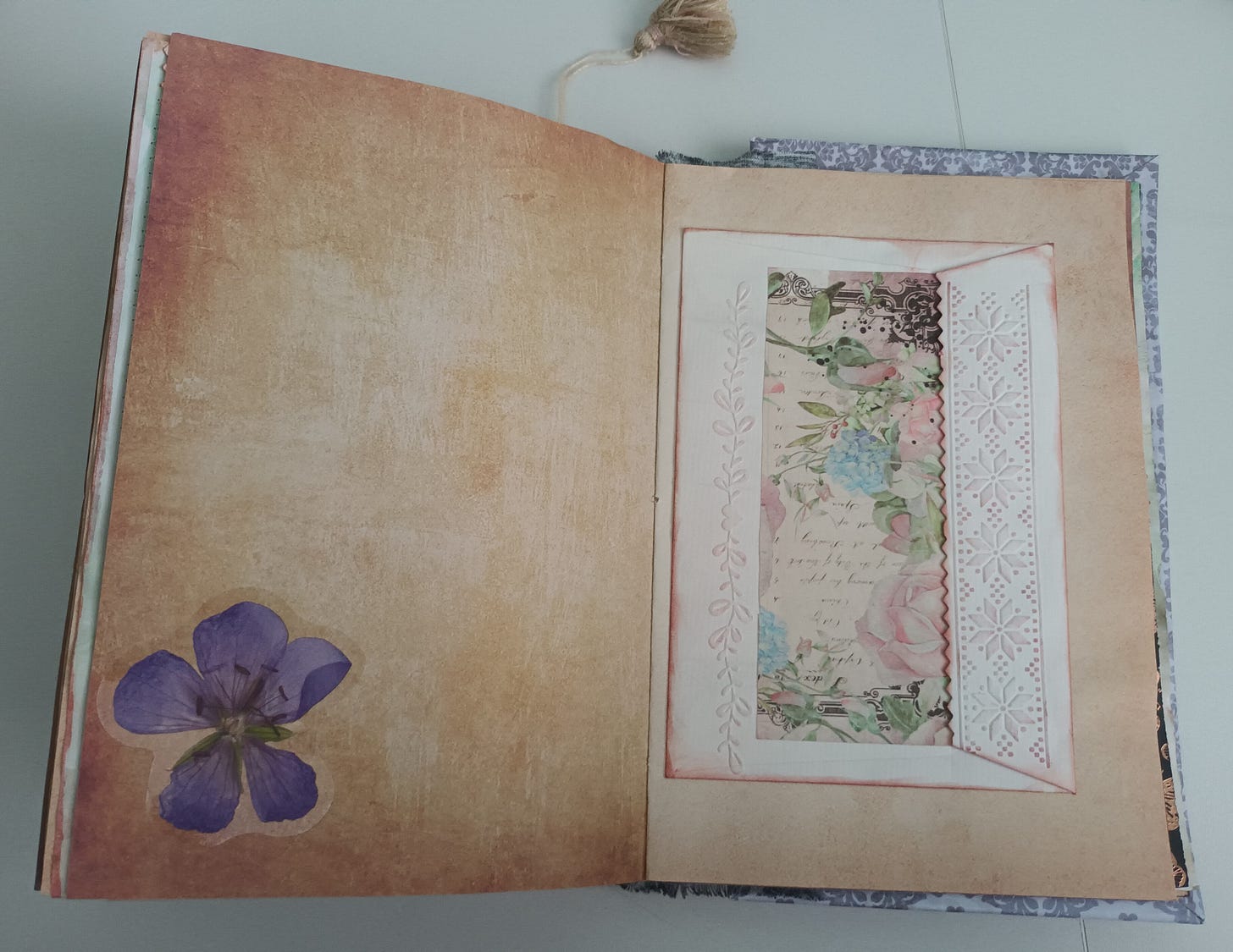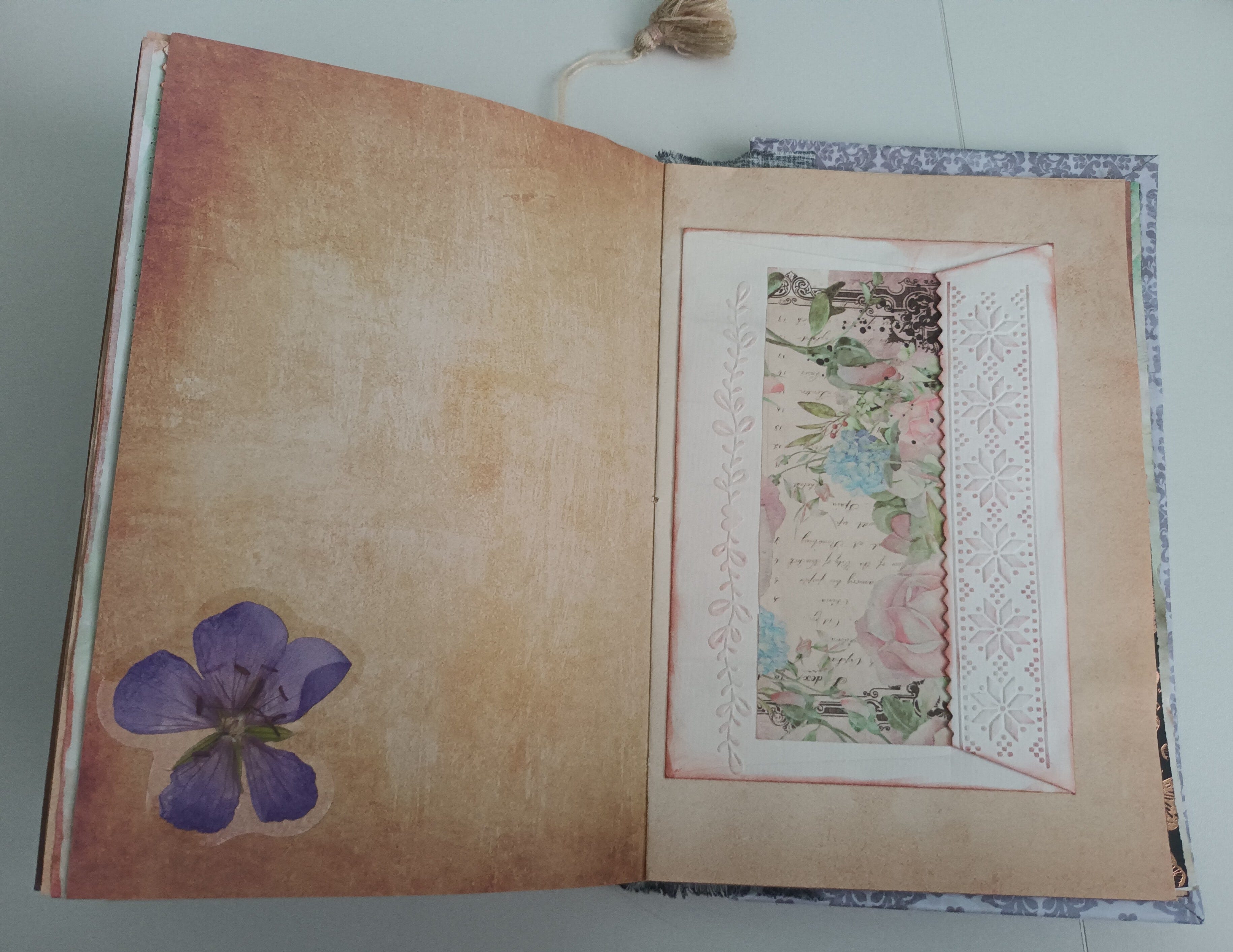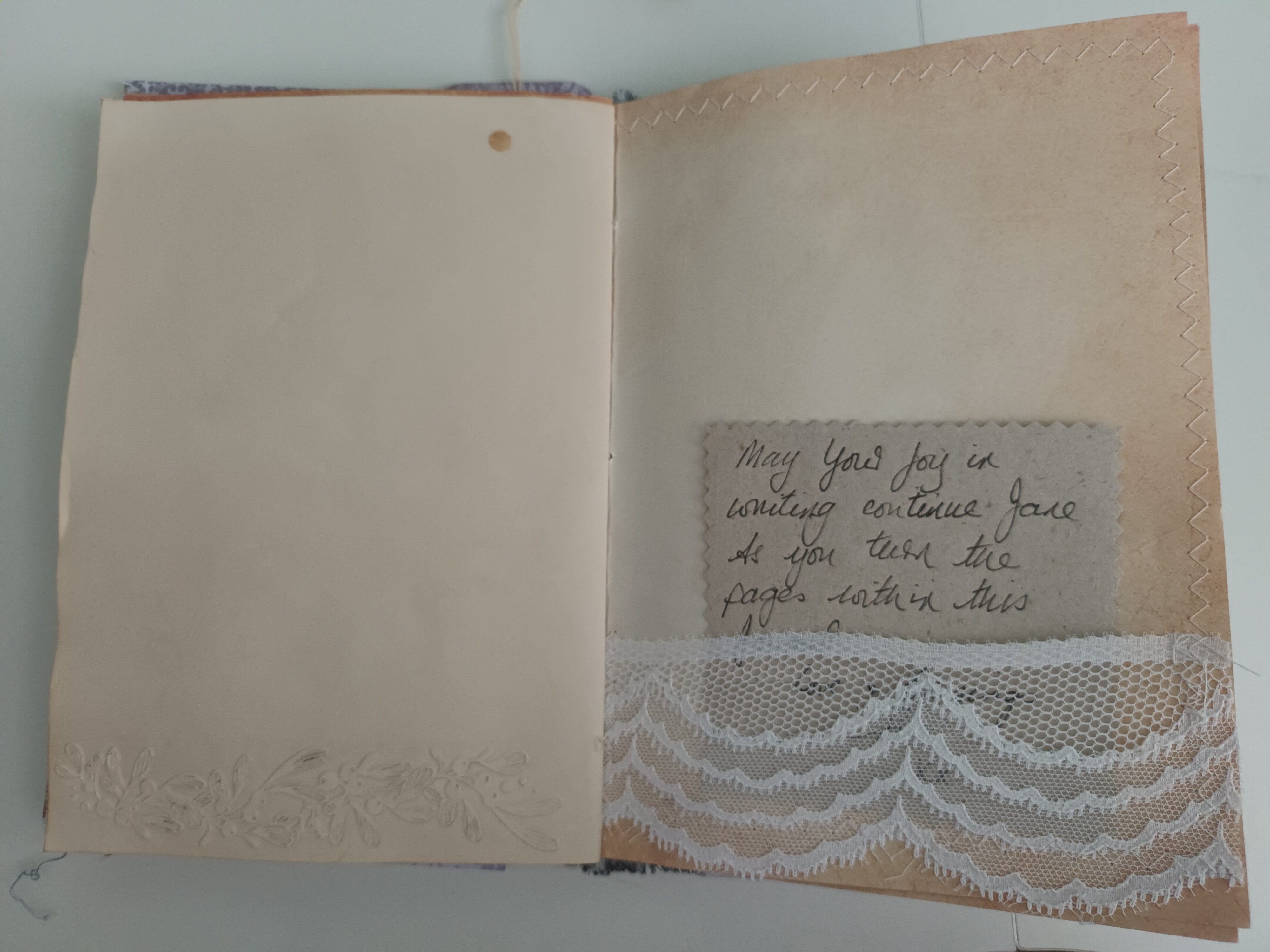 My lovely friend, Sue, handmade a journal as my Christmas gift. I was in awe as I opened her parcel on Christmas morning, as I had never received anything like it. Sue made each page from her handmade paper and learnt how to hand stitch and bind them together. Inside, she thoughtfully placed art cards and envelopes in lace pockets, a bookmark, sayings and poetry, a little handmade notebook, stencilled flowers and leaves, stitching, stamping and delicate paintings.