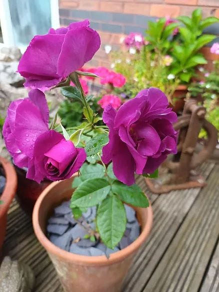 In March, we planted eight rose bushes in our front garden raised bed that Tim created, surrounded them with bulbs, mulched and hoped. They all thrived bar one, which remained as two brown sticks above ground. We delighted in watching the different colours of roses as the others bloomed, and the bulbs sprang into life, and a few months ago, I went to dig up the sticks and replace the rose.